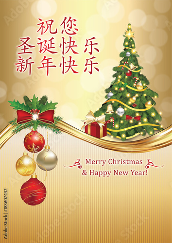 Merry Christmas And Happy New Year Greeting Card Card The Holiday Season With Text In Chinese And English Buy This Stock Illustration And Explore Similar Illustrations At Adobe Stock Adobe Stock