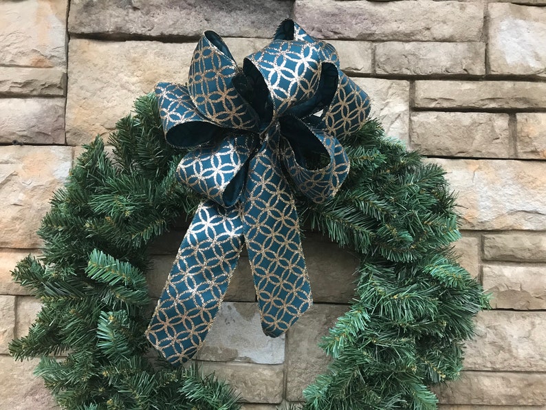 4 Large Wired Teal And Gold Christmas Bows 6 Yards Peacock Blue Ribbon Christmas Bows Teal