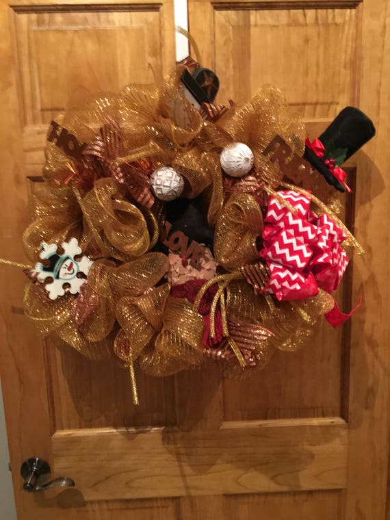 Gold And Red Deco Poly Mesh Christmas Wreath Primative Etsy