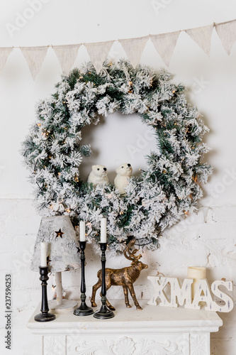 A Traditional Bright Christmas Wreath Hanging Over The Fireplace On A White Brick Wall And Packaged Gifts Are Stacked On A Fireplace With Candles Stock Photo Alamy