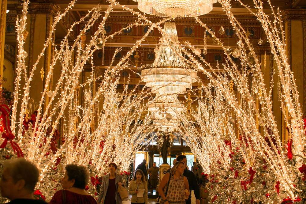 All Across The Country Hotels And Merchants Are Stringing Up Lovely Lights And Decking Their Halls For Us To Holiday Lights Christmas Stage Design Hotel Lobby